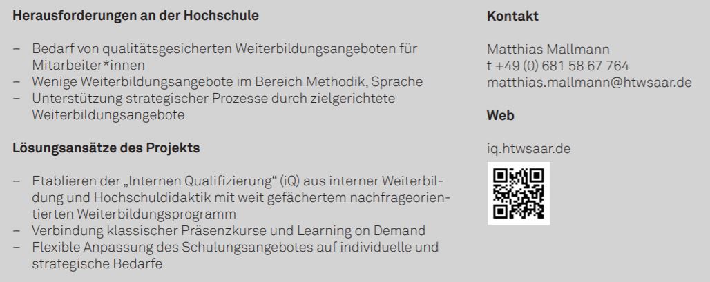 Eine Hochschule ist nur so gut wie ihre Beschäftigten. Doch lange Zeit konzentrierte sich die Vermittlung von Wissen und die Förderung von Kompetenzen an der htw saar auf ihre Studierenden. Mittlerweile hat sich die interne Weiterbildung zu einem wesentlichen Pfeiler der Personalentwicklung entwickelt. „Bis zum Jahr 2012 gab es an unserer Hochschule außer im Bereich Hochschuldidaktik keine umfassende interne Weiterbildung für Mitarbeiter und Mitarbeiterinnen“, weiß Matthias Mallmann. „Der Qualitätspakt Lehre gab den Startschuss, diese Situation zu ändern.“ Der Teilprojektleiter bekam freie Hand, im Rahmen der mit der Stabsstelle für Hochschuldidaktik neu gebildeten Einheit „Interne Qualifikation“ (iQ) ein umfangreiches Portfolio an Weiterbildungsangeboten aufzubauen. Von klassischen Schlüsselqualifikationen wie der Fremdsprachenkompetenz über IT-Expertise bis zur Wissenschaftskommunikation – der Pool an Angeboten und Partnern wuchs schnell.