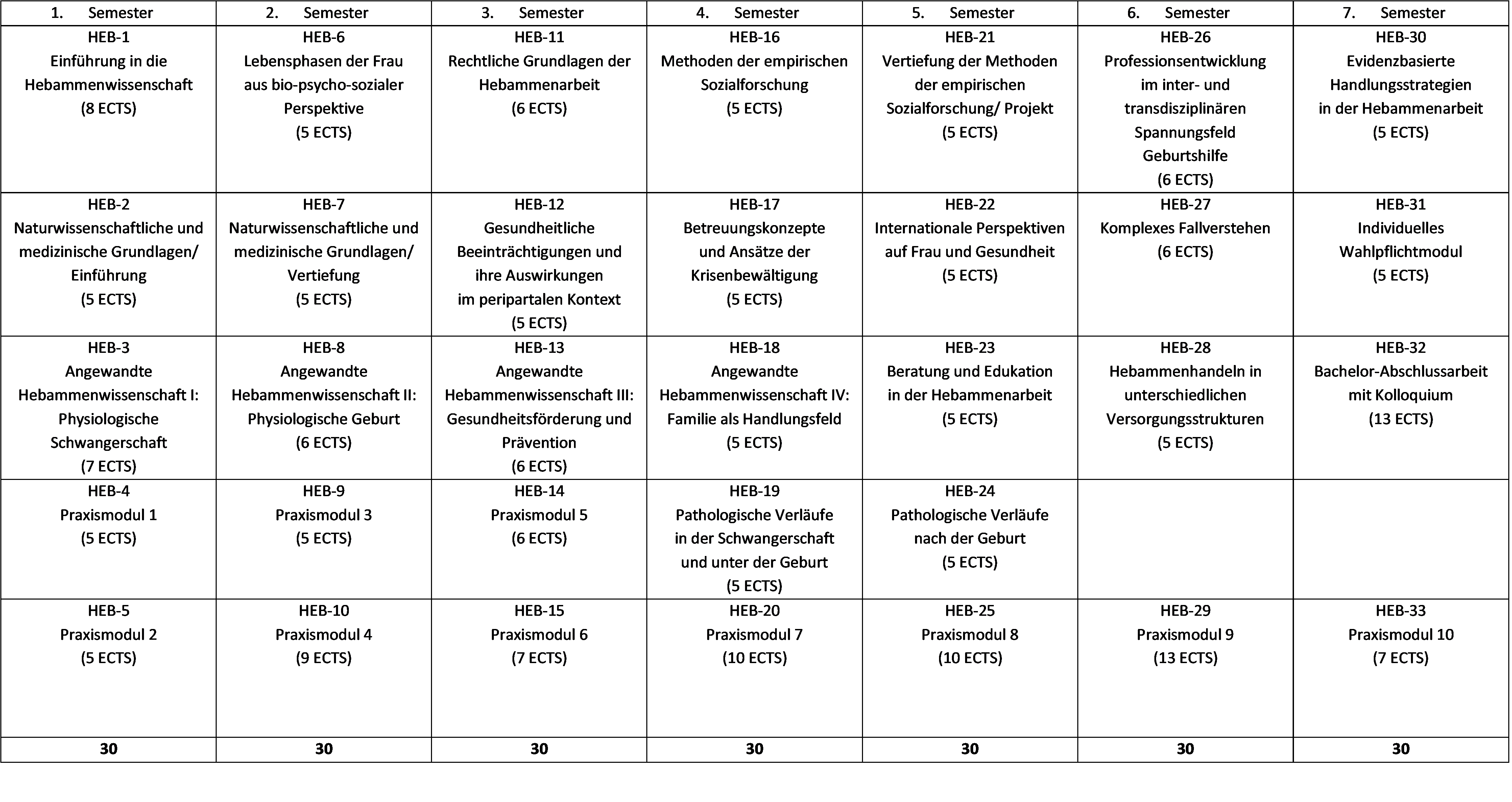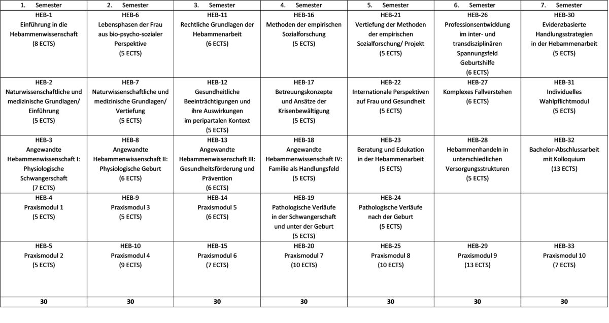 Das Curriculum im Studium ist modular aufgebaut und orientiert sich im beruflichen Handlungsfeld der Hebamme am Betreuungsbogen der Hebammenarbeit. Der Betreuungsbogen setzt sich aus den unterschiedlichen Tätigkeitsbereichen der Hebammenarbeit zusammen und steht zudem für Versorgungskontinuität durch Hebammen. Er reicht von der Familienplanung über Schwangerschaft, Geburt, Wochenbett und Stillzeit bis hin zur Familienbegleitung im ersten Lebensjahr. In der ersten Studienhälfte werden die Betreuungsprozesse und –aufgaben von Hebammen in der Begleitung physiologische Prozesse fokussiert. In der zweiten Studienhälfte liegt der Schwerpunkt auf der Kompetenzentwicklung im Feld der interdisziplinären Zusammenarbeit, sowie der umfassenderen Analyse des beruflichen Handlungsfeldes und den dazugehörigen Rahmenbedingungen.