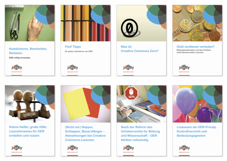 Insgesamt 8 Broschüren sind im Rahmen des Verbundprojektes JOINTLY erschienen. "Sie setzt sich mit freien Lizenzen und den urheberrechtlichen Aspekten von offenen Bildungsmaterialien auseinander. Sie sind als Aufklärung und Handlungshilfen für OER-Akteure gedacht, richten sich an Einsteiger und Fortgeschrittene aller Bildungsbereiche".