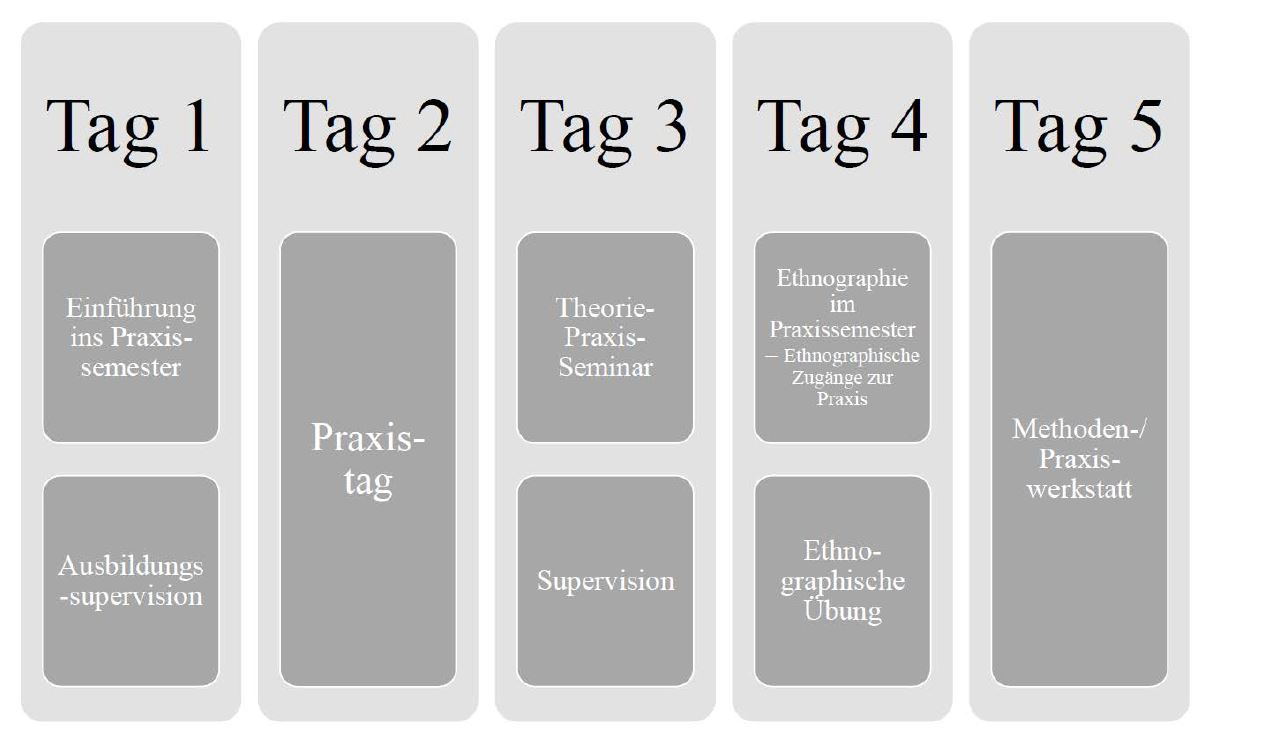 Die Blockwoche dient der Einführung der Studierenden in die Rahmenbedingungen des Praxissemesters und findet Ende August/ Anfang September eines jeden Jahres statt. Die Blockwoche ist Bestandteil der Seminare zum Praxissemesters und damit ein verpflichtender Teil des Praxissemesters. Die Klärung der organisatorischen Rahmenbedingungen, wie die Einteilung in die Supervisionsgruppen und Theorie-Praxis-Seminare, sind ebenso Bestandteil der Blockwoche wie die Einführung in die methodologische und methodische Ausgestaltung des Praxissemesters mit ersten Übungen. Auch findet, falls dies im Vorfeld noch nicht geschehen, eine erste Hospitation in der gewählten Praxiseinrichtung statt sowie die Teilnahme an einer ersten Supervision und dem Theorie-Praxis-Seminar. Im Fokus stehen dabei in dieser Woche auch die eigenen Vorerfahrungen, Erwartungen und Ziele der Studierenden.