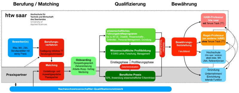 Die Durchführung einer Nachwuchsprofessur erfolgt an der htw saar je nach Qualifikationszeit (ein bis max. drei Jahren) immer im Tandem mit einem Kooperationpartner, um sicherzustellen, dass die erforderliche außerhochschulische berufliche Praxiserfahrung für eine Bewerbung auf eine HAW-Professur erreicht wird. Dabei kann bereits die Ausschreibung einer Nachwuchsprofessur mit einem festen Partner erfolgen. Des Weiteren besteht die Möglichkeit, die Ausschreibung der Nachwuchsprofessur ohne festen Partner zu initiieren und diesen im Verlauf des Berufungsverfahren zu definieren. Zur Unterstützung des Matchings zwischen Kooperationspartner und Kandidat*in wurde hierzu das Netzwerk für Nachwuchskräfte gegründet.