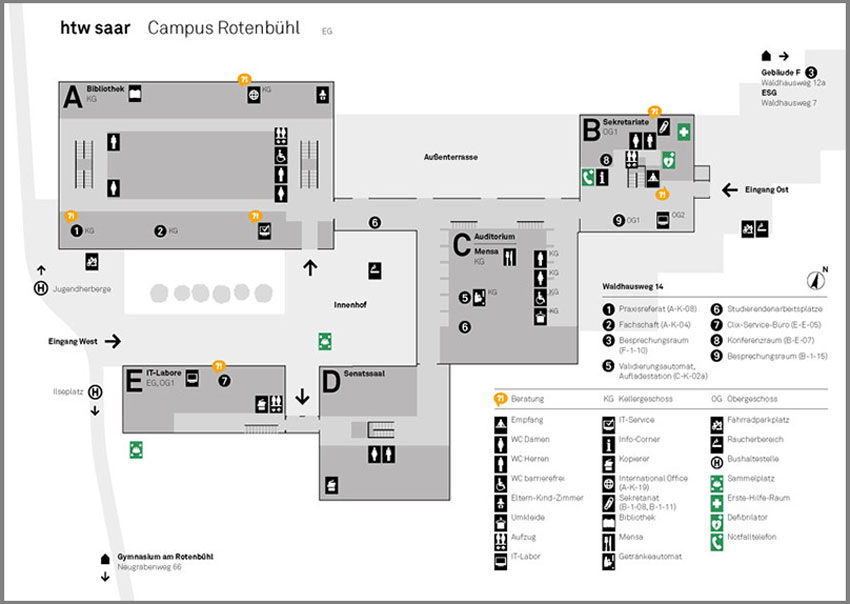 Samstag: 7:30 Uhr bis 16:00 Uhr (Gebäude D+E geschlossen)
