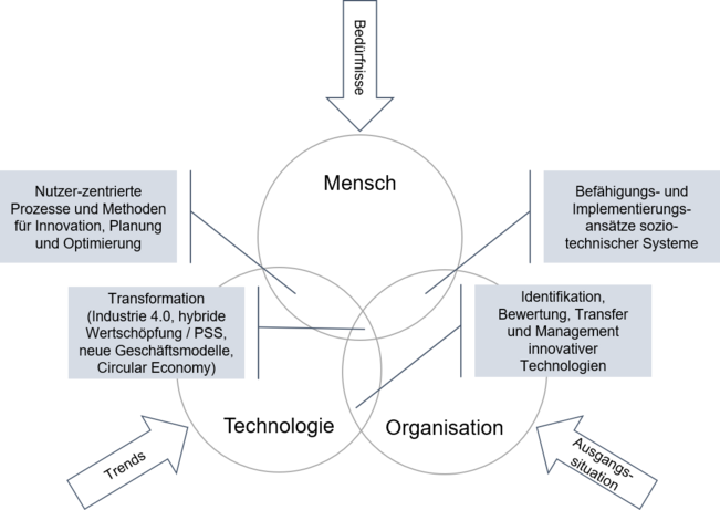 Mehrdimensionale Erforschung von Innovations- und Transformationsprozessen in (industriellen) Wertschöpfungssystemen & -netzwerken unter Berücksichtigung der Faktoren Mensch, Technologie und Organisation sowie der sinnhaften wirtschaftlichen und ökologischen Verankerung in Form von Geschäftsmodellen (MTO-W-Ansatz). Von besonderem Interesse sind dabei die Trends Digitalisierung und Nachhaltigkeit.