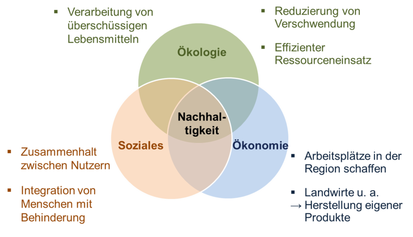 Im Projekt werden die drei Säulen der Nachhaltigkeit (Ökologie, Ökonomie und Soziales) in ein ganzheitliches Konzept einbezogen. Ökologische Aspekte finden Berücksichtigung, indem die Nutzer Lebensmittelüberschüsse verarbeiten können, wodurch Lebensmittelverschwendung reduziert wird. Ökonomische Aspekte werden durch die Schaffung von Arbeitsplätzen und die Wertschöpfungssteigerung infolge der Verwertung miteinbezogen. Soziale Belange werden gefördert, indem Menschen mit Behinderung im Co-Working Space tätig werden. Am Ende des Projekts liegen potenziellen Gründern Informationen und Empfehlungen zum Aufbau nachhaltiger Food Co-Working-Spaces vor.