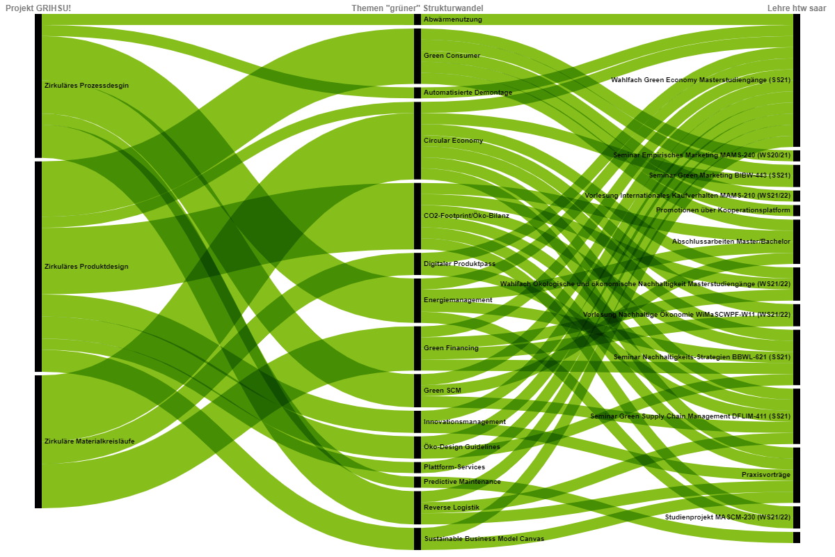 Dieses Sankey-Diagramm visualisiert den inhaltlichen Fluss aus dem Projekt GRIHSU! zu wichtigen „grünen“ Themen in die Lehre der htw saar.