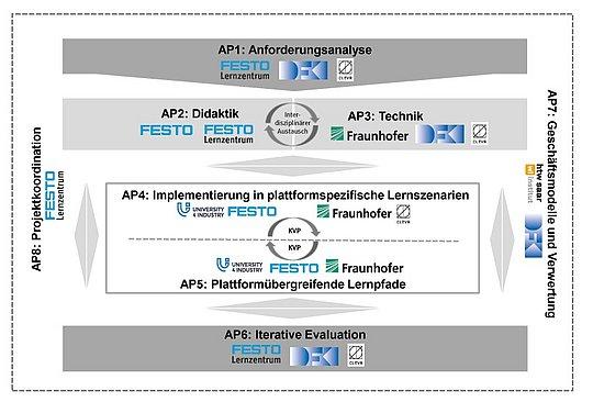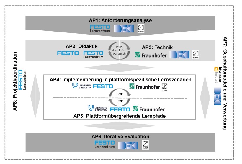 Im Zentrum des Projektes steht die Anreicherung dreier, derzeit in sich geschlossener, Lernplattformen mit Bildungsinnovationen wie einem digitalen Drilling, einer verbindenden Common Learning Middleware, einem Recommender-System, einem digitalen Zertifizierungsservice sowie der interoperablen Gestaltung und Weiterentwicklung hin zu plattformübergreifenden, individuellen bzw. zielgruppenspezifischen Lernpfaden. Die entwickelten interoperationalen Plattforminnovationen und KI-Lösungen werden plattformunabhängig im Projekt entwickelt und dem Konsortium und Interessierten zur Verfügung gestellt.